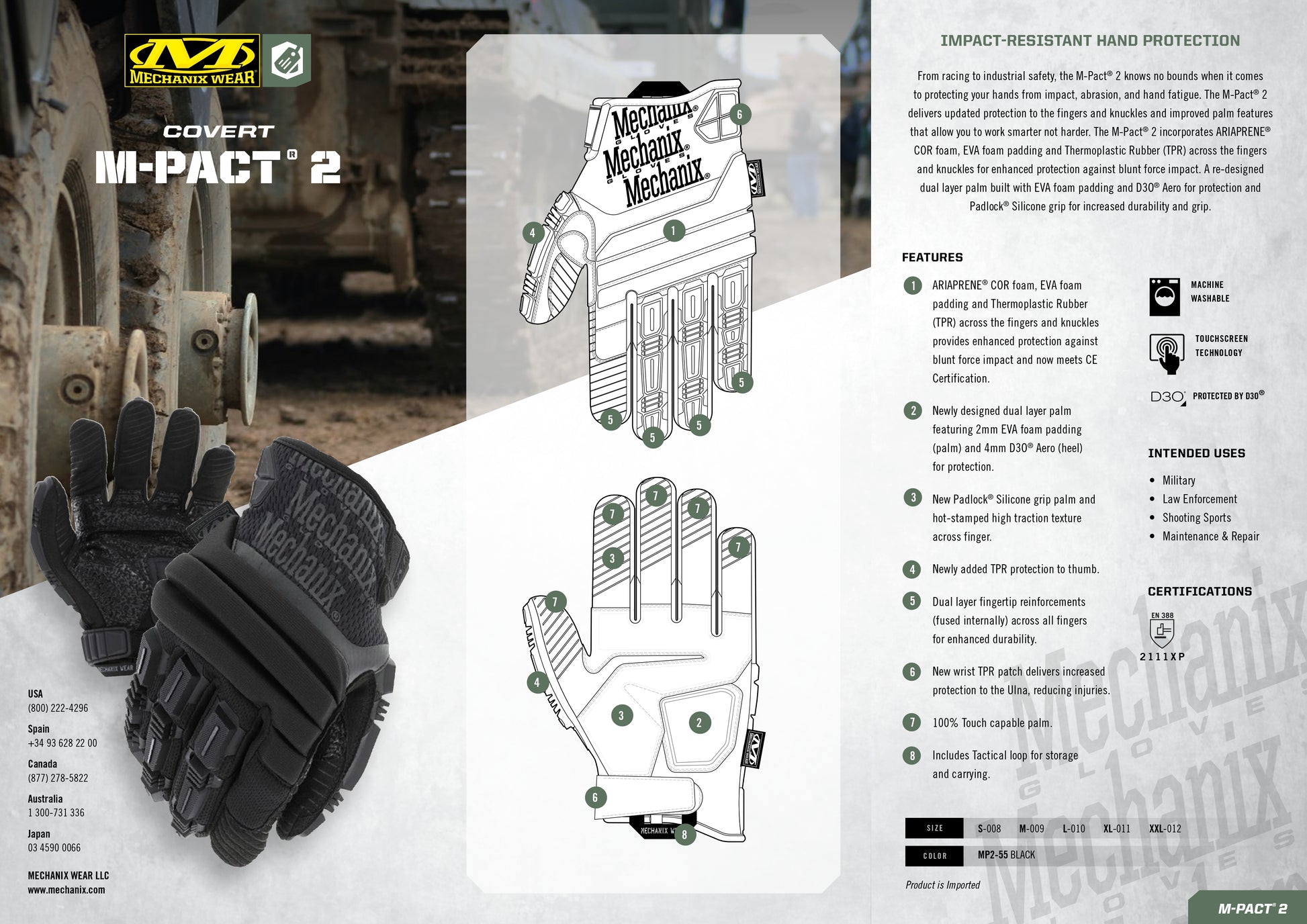 M-Pact® 2 er utstyrt med ARIAPRENE® COR-skum, EVA-skumdemping og termoplastisk gummi (TPR) over fingrene og knokene for økt beskyttelse mot støt. Den nyutformede, doble håndflaten har EVA-skumdemping og D3O® Aero for beskyttelse, samt Padlock™ silikongrep for bedre slitestyrke og grep.